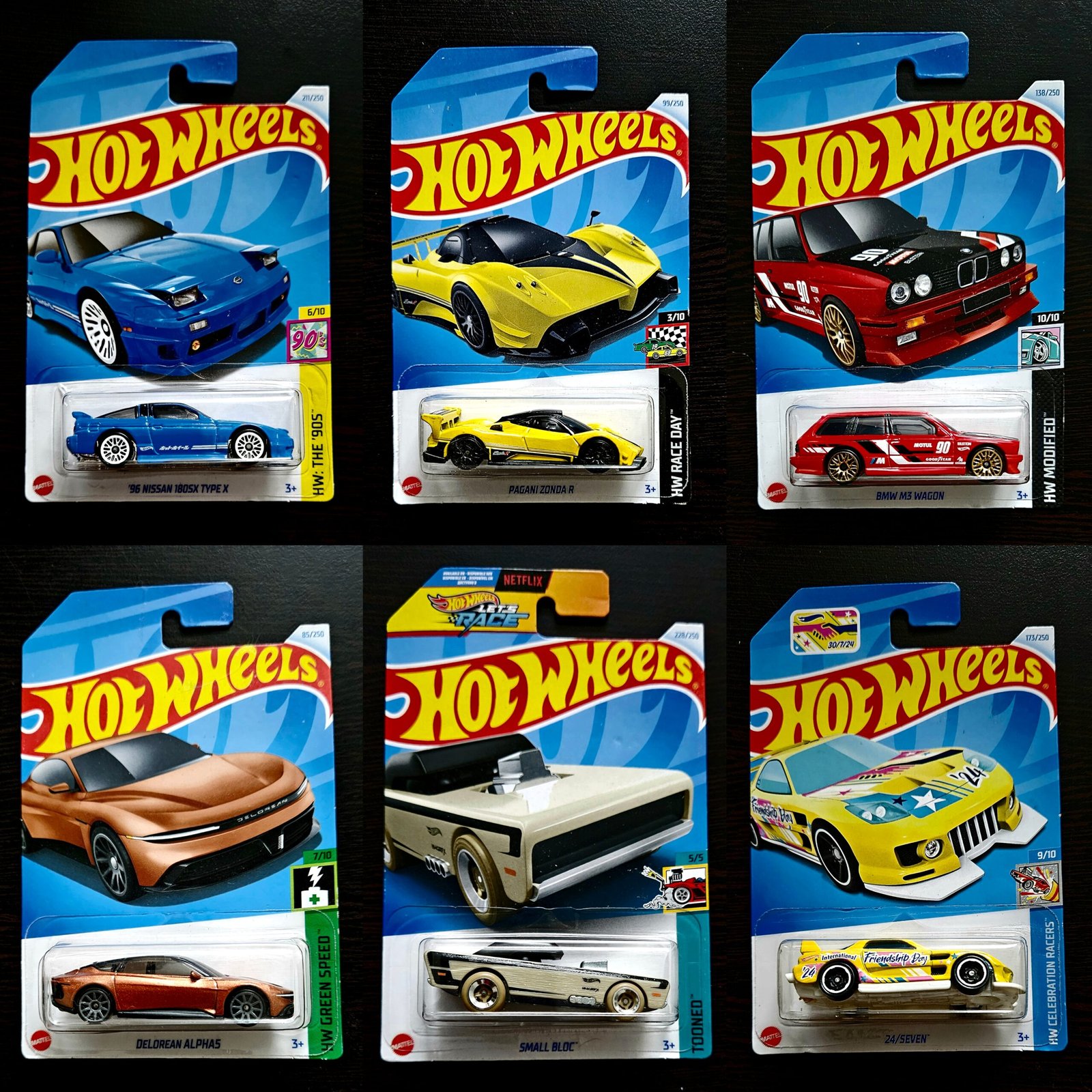Unleash a collection that blends Hot Wheels originals, pop culture heroism, German performance practicality, Japanese tuner style, Italian hypercar prowess, and classic American hot rod spirit in the “Hot Wheels Mainlines Combo Set”! This exciting Hot Wheels combo brings together six distinct vehicles from the Hot Wheels mainlines series, showcasing a thrilling mix of imaginative designs and real-world automotive influences. Featuring the unique 24/SEVEN, the heroic Bumblebee, the practical BMW M3 Wagon, the drift-ready ’96 Nissan 180SX Type X, the track-focused Pagani Zonda R, and the classic hot rod Small Bloc, this set is a must-have for collectors who appreciate a diverse range of Hot Wheels creativity and automotive enthusiasm in 1:64 scale.