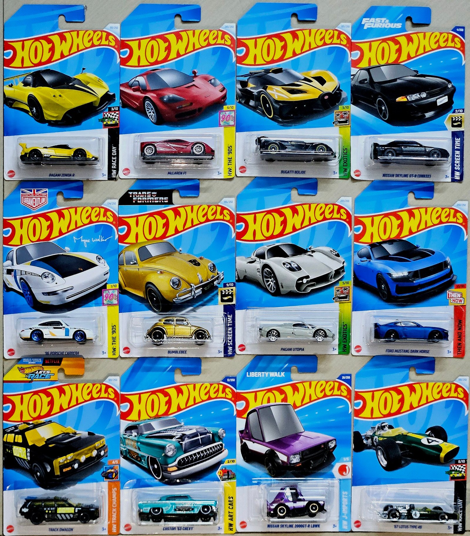 Hot Wheels CMB SP1 – NISSAN SKYLINE GT-R(BNR32),MCLAREN F1,BUGATTI BOLIDE,FORD MUSTANG DARK HORSE,PAGANI UTOPIA,TRUCK DWAGON,PAGANI ZONDA,’96 PORSCHE CARRERA,BUMBLEBEE,CUSTOM ’53 CHEVY,NISSAN SKYLINE 2000GT-R LBWK,’67 LOTUS TYPE 49